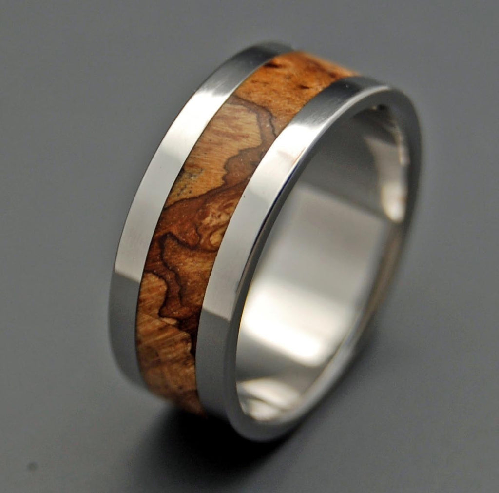 The sweetest tree. Each cut of Maple is slightly different but equally wondrous, filled with unique topographical burl. A generous inlay is centered between two standard width titanium edges, polished to a mirror finish. Pictured at 6.4mm.