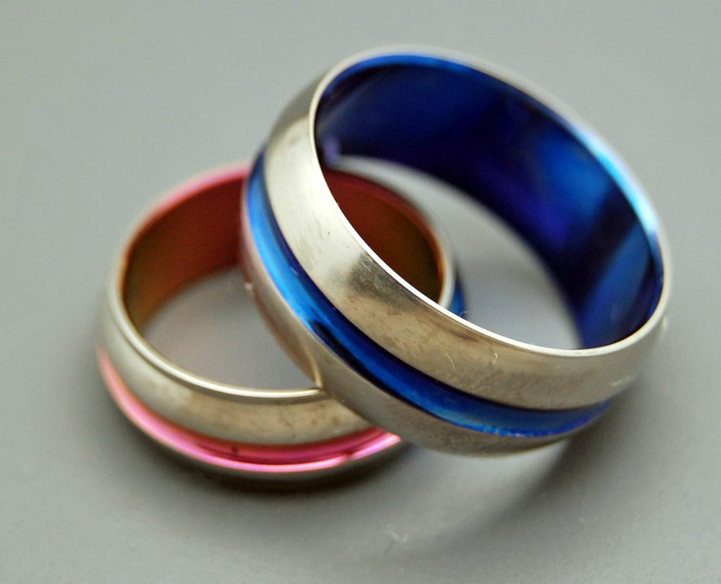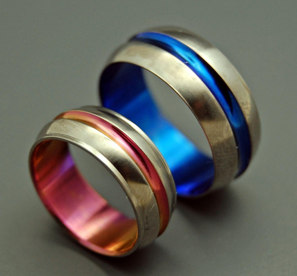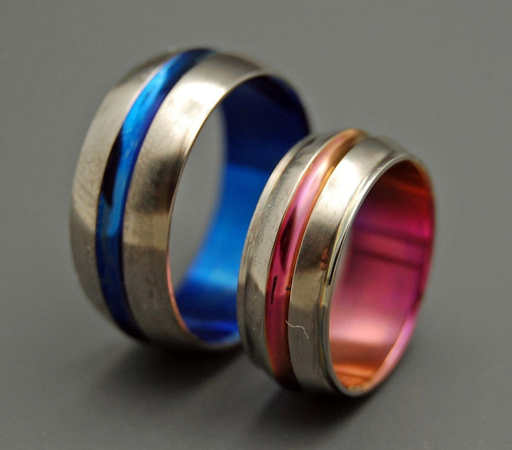 Love begins. A playful set featuring our beveled signature ring style, each accented by a blush of color, marking the way a loving pair so effortlessly compliments one another. Mirror finish. Pictured at 6.4mm and 9.5mm.