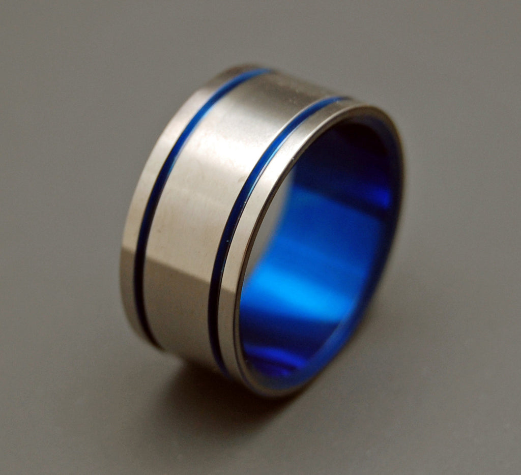 Head of the class. Handcrafted from a single billet of pure titanium, this band is bookended by two bold pinstripes and a matching anodized blue interior. Mirror finish. Pictured at 7.9mm.