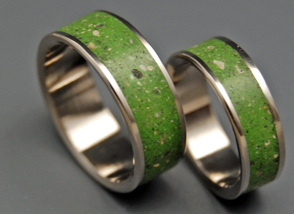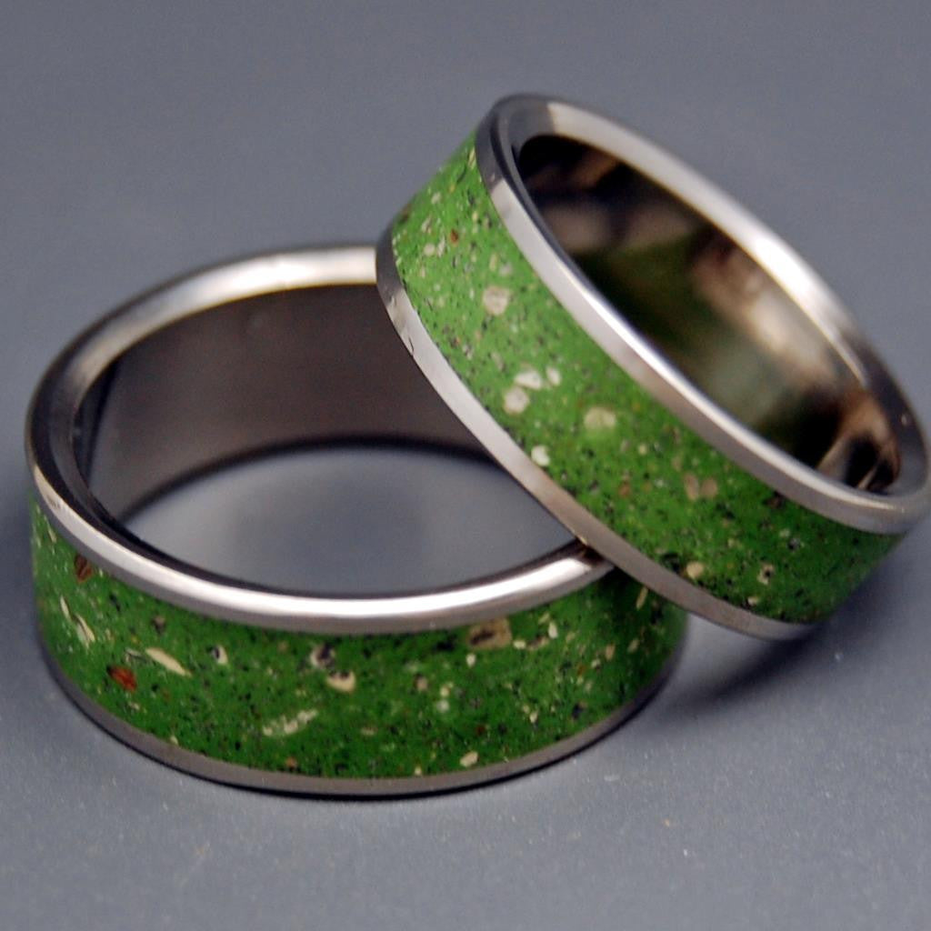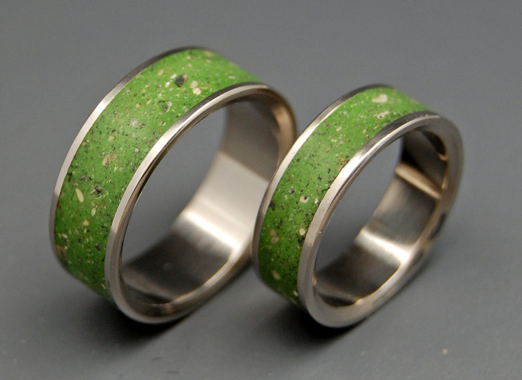 Go green. Concrete is modern and timeless, with unlimited possibilities in style, texture and color. This band set is the perfect blend of bright grassy green and earthy pebbled grain set flush in titanium, smooth to the touch. Thin width titanium edges, mirror polish. Pictured at 6.4mm and 7mm.