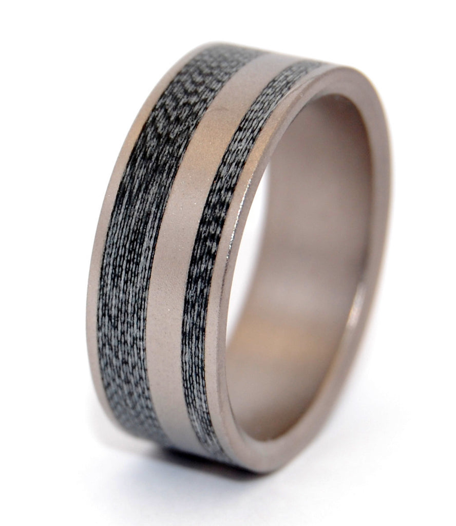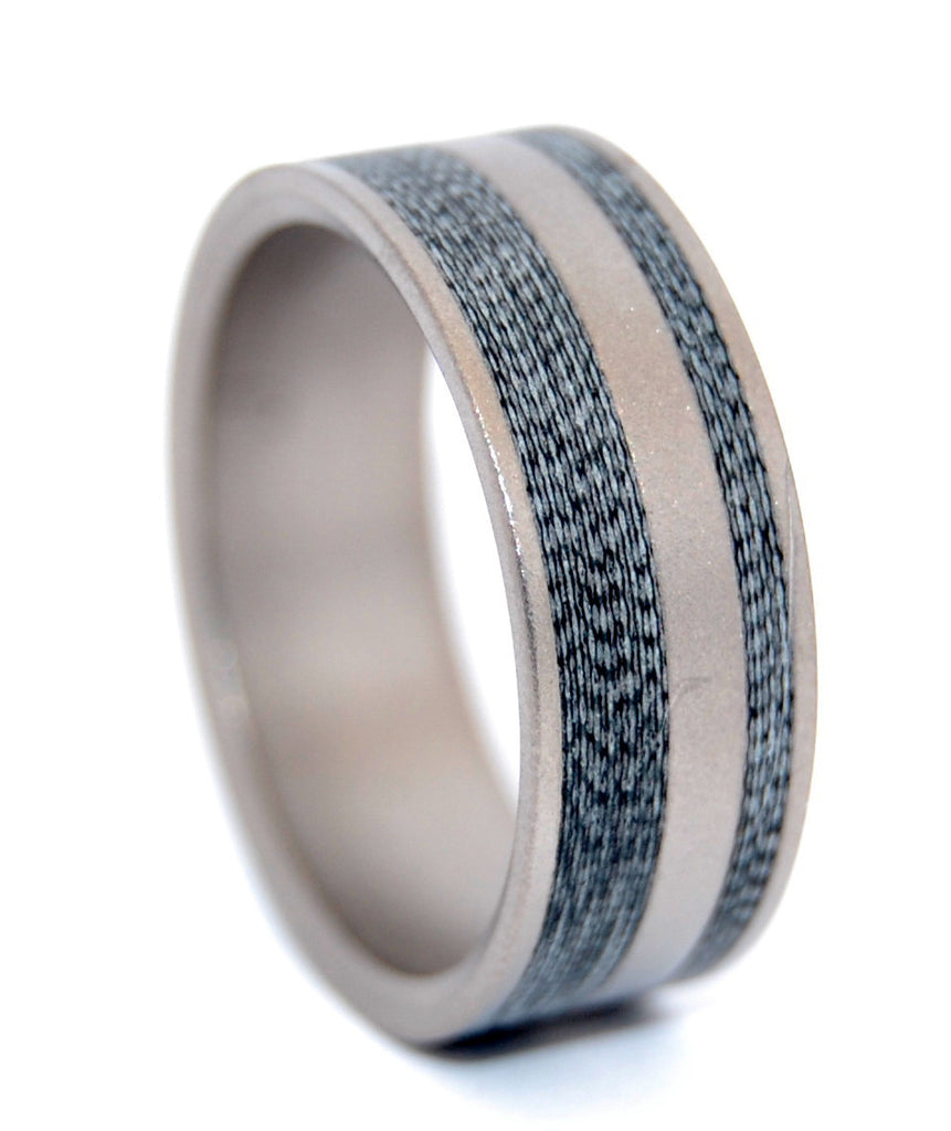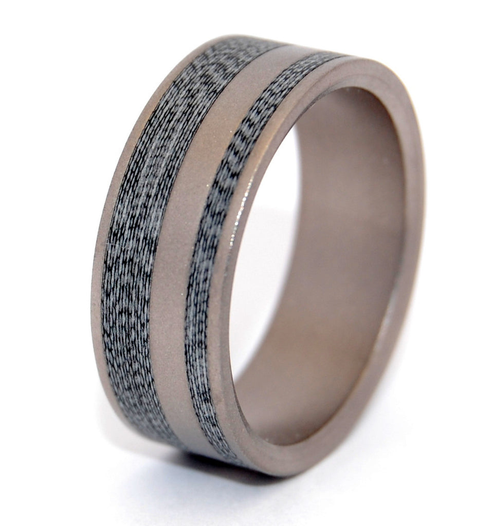 Blast off. A double offset inlay of brushed carbon fiber in a glass bead blast titanium band. Takes a pretty tough guy (or girl!) to wear this band. Thin edges, mirror finish. Pictured at 7.9mm.