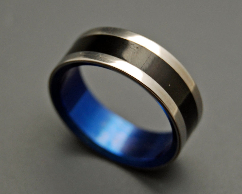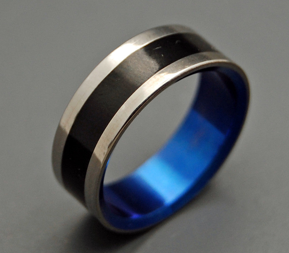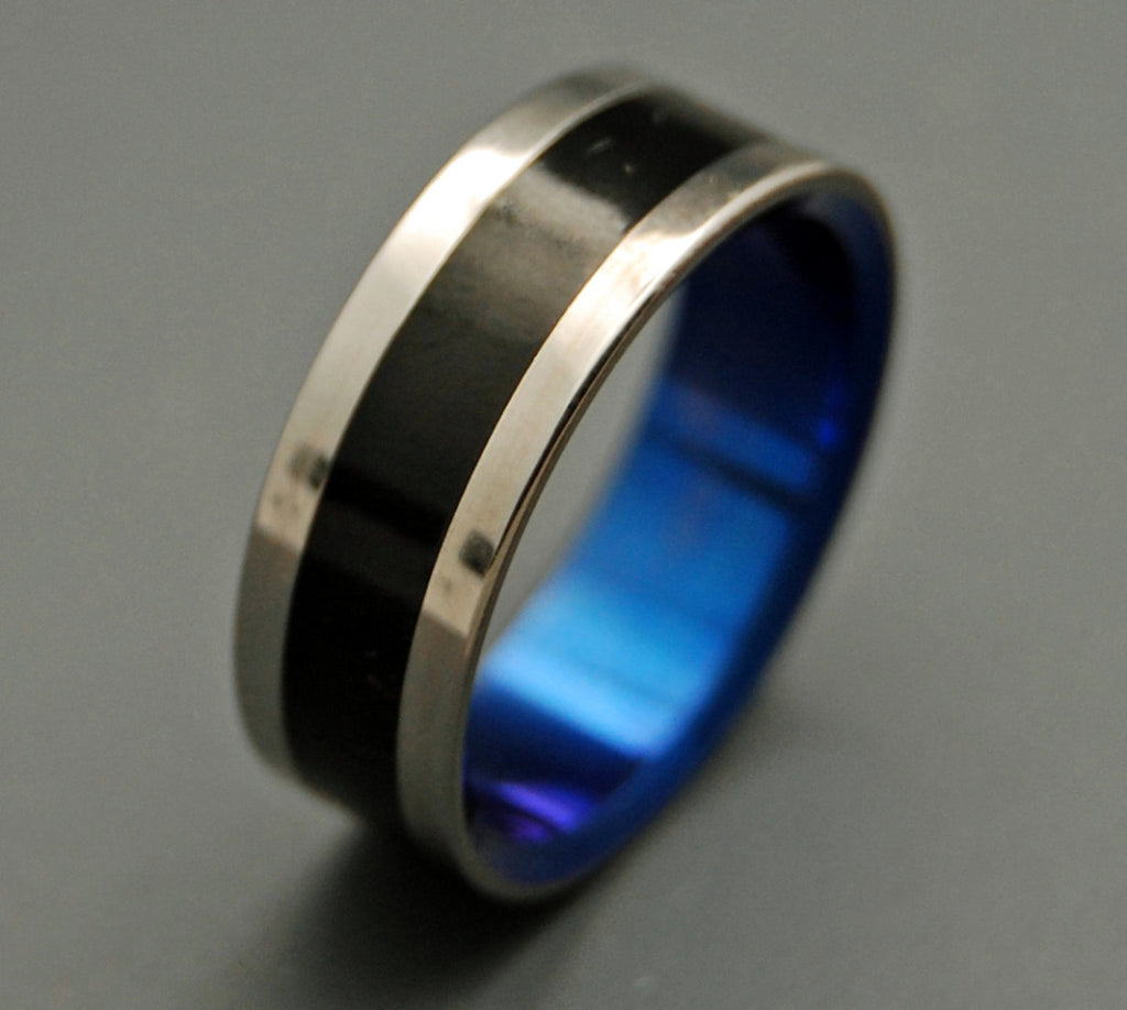 Strong enough to withstand the impact of two 1200 pound creatures headbutting each other... Water Buffalo horn is naturally tested and durable! Jet black with dark chocolate undertones, it compliments titanium's shine and creates a gorgeous band. An anodized sapphire blue interior glows. Standard edge, mirror finish. Pictured at 6.4mm.