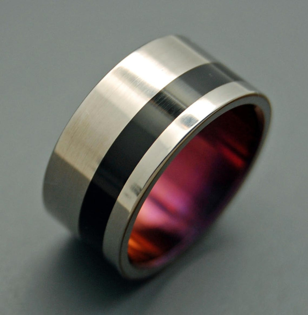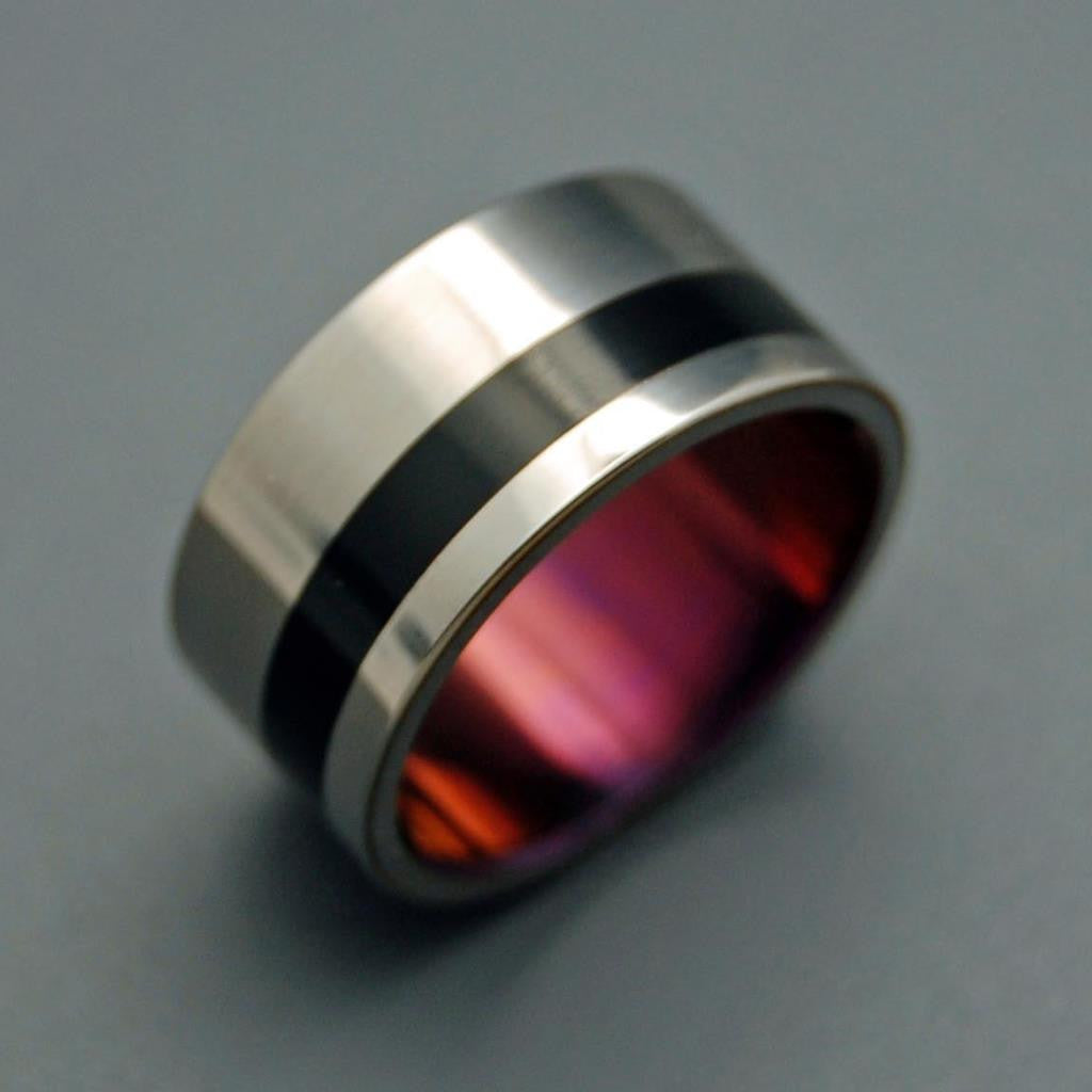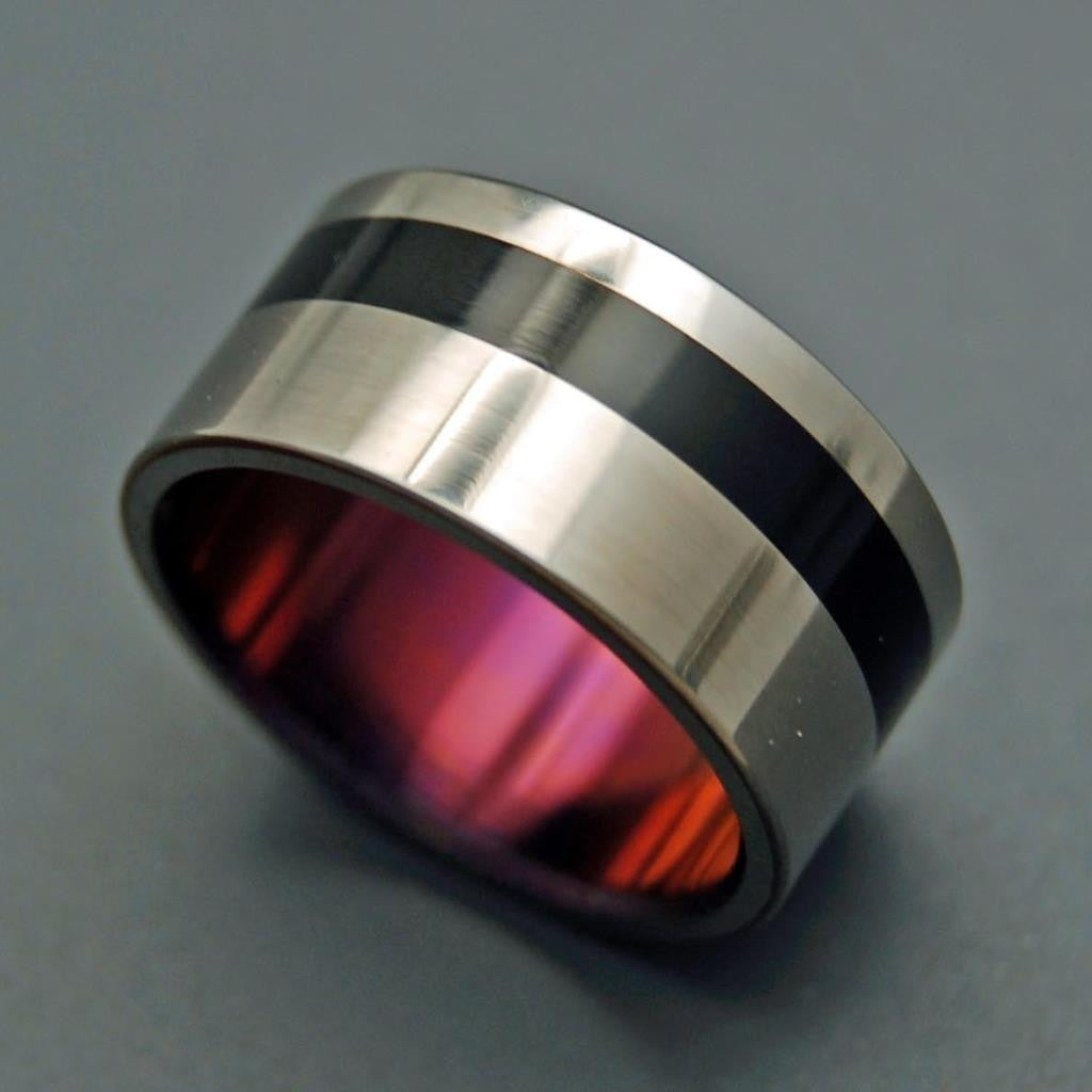 A toast to romance. This classic offset band feaures a jet-black resin inlay with notes of deep ruby to purple at its throat. Mirror finish. Pictured at 9.5mm.