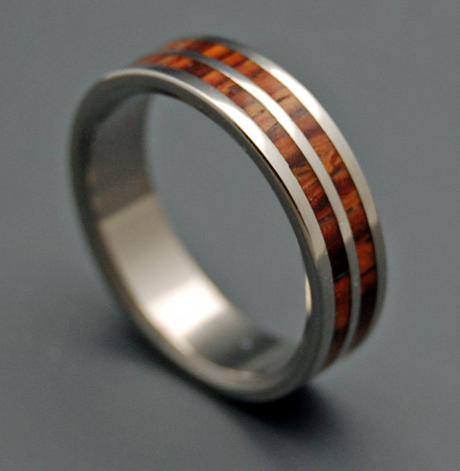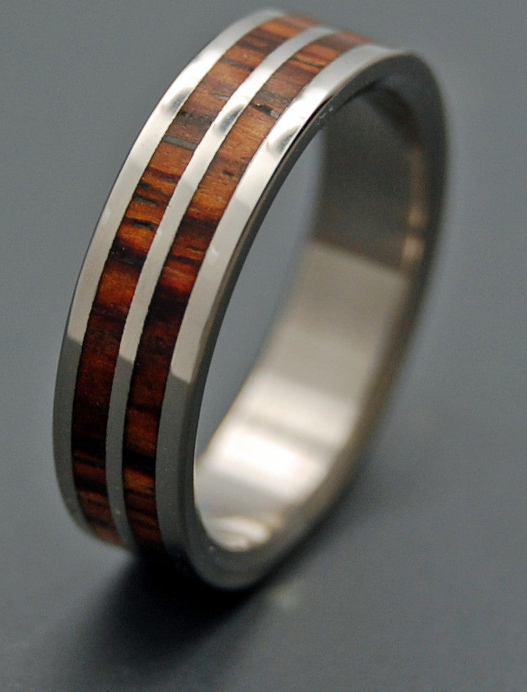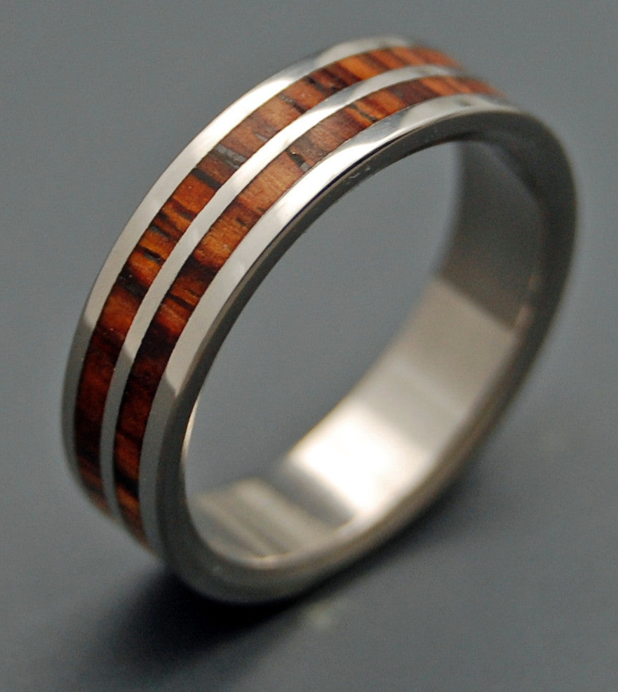 Double your pleasure. Symmetrical inlays of light Cocobolo wood hug a mirror finish titanium band. Oil-rich Cocobolo is a natural choice for a luxurious inlay that is durable and water resistant. Thin width titanium edges.