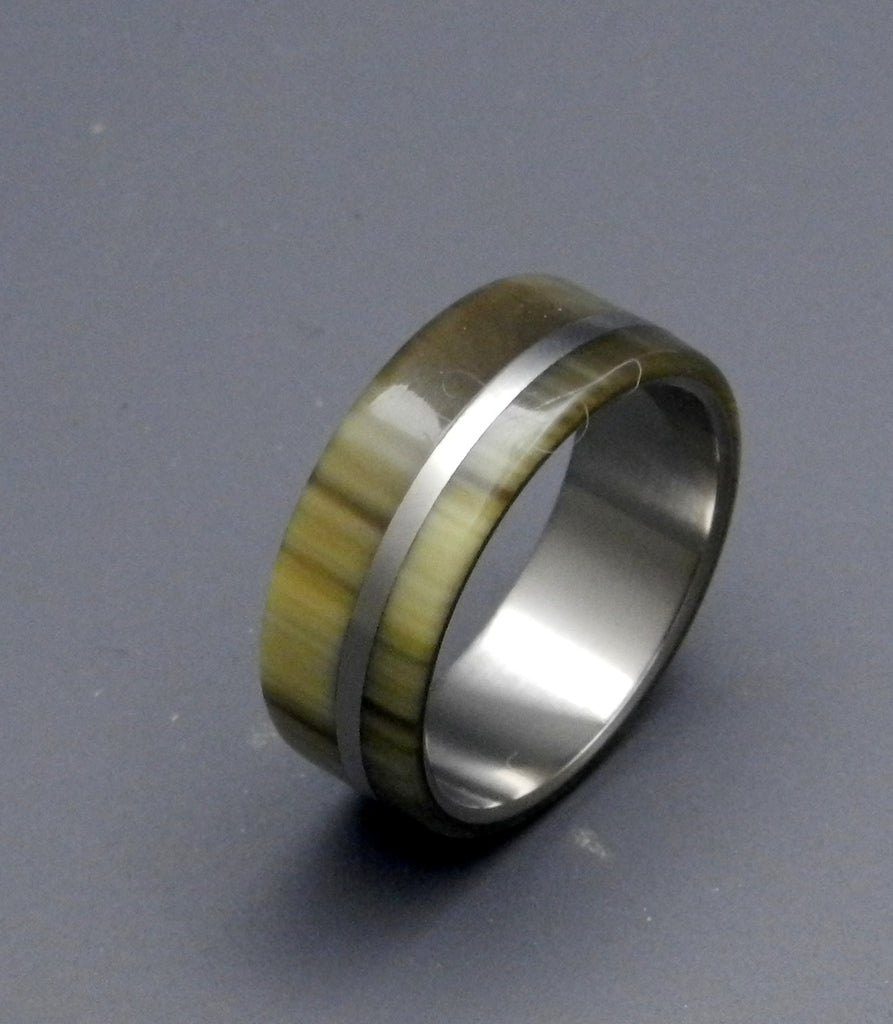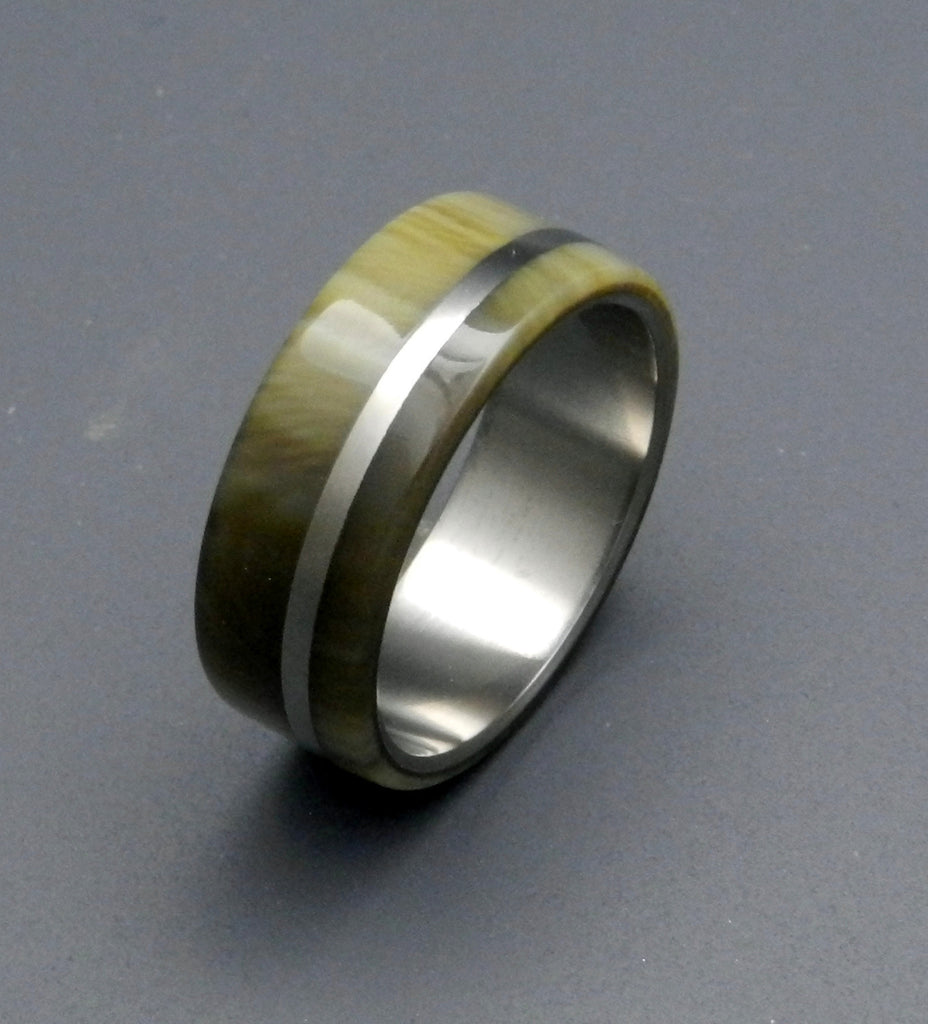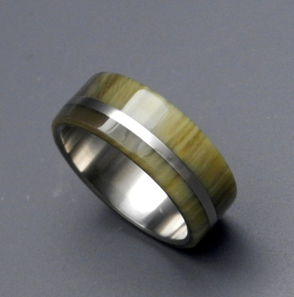 Rich. A double-inlay of honey and tortoise-toned cattle horn is offset by a titanium band buffed to a mirror finish, creating a sensuous and stylish ring. Pictured at 7.9mm.