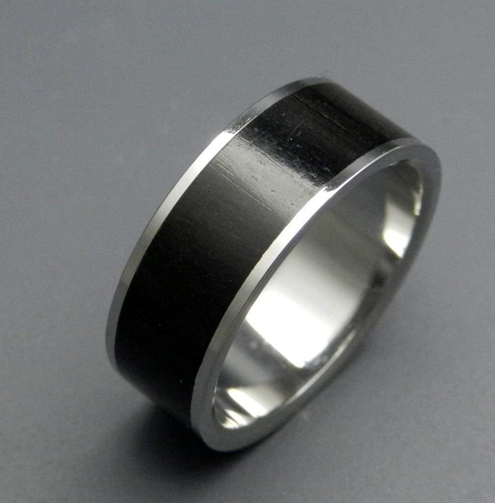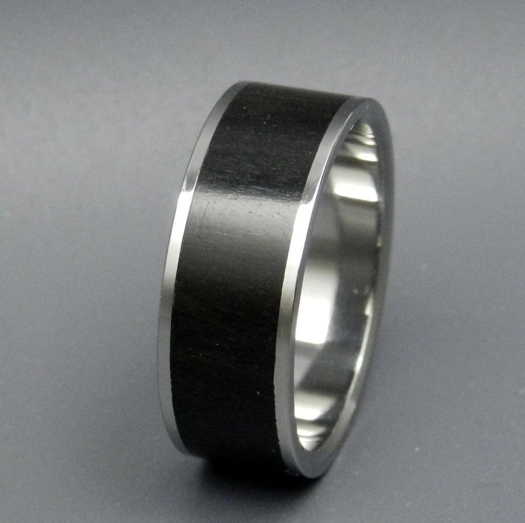Love's silent wonder. Showcased between two ultra thin titanium edges, a generous inlay of Gabon Ebony is as black as the darkest night. Mirror finish. Pictured at 7.9mm.