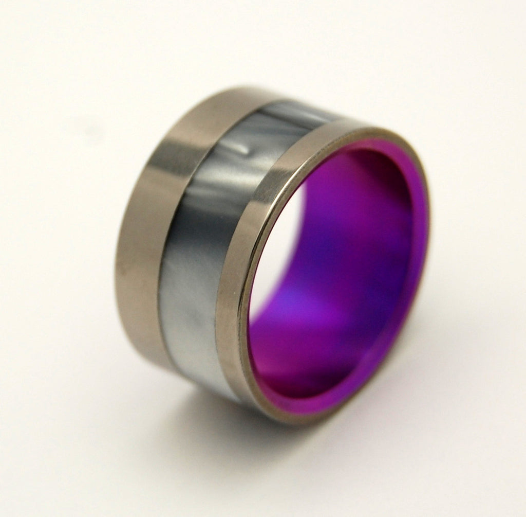 Bold and Daring - this band makes it happen! Gray marbled opalescent is offset in a mirror finish titanium band. An electric purple interior sizzles.Pictured at 11mm.