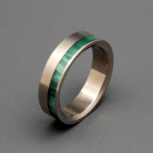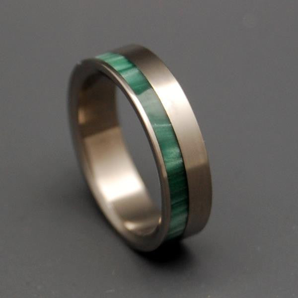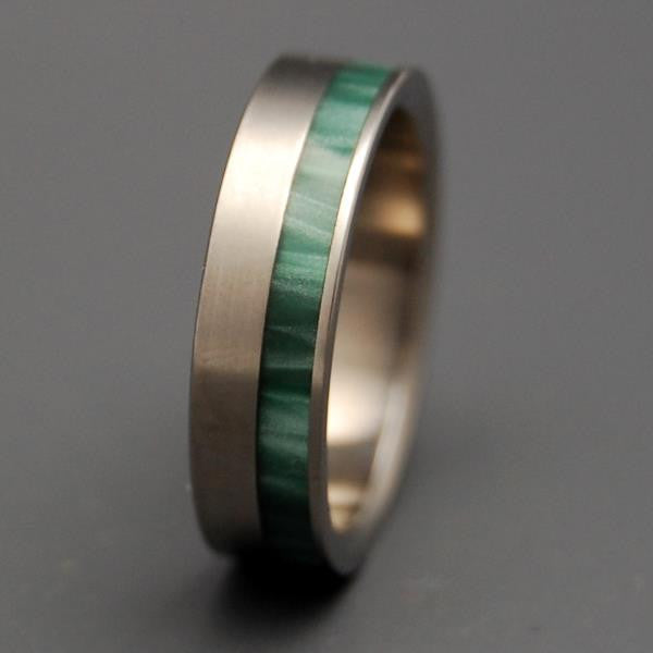 Mythical and magic. Fauna pairs shining titanium with glowing green opalescent for a gentle, inspiring ring. A narrow, offset inlay with a mirror finish. Pictured at 6.4mm