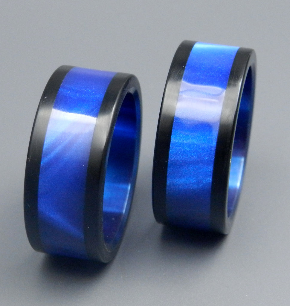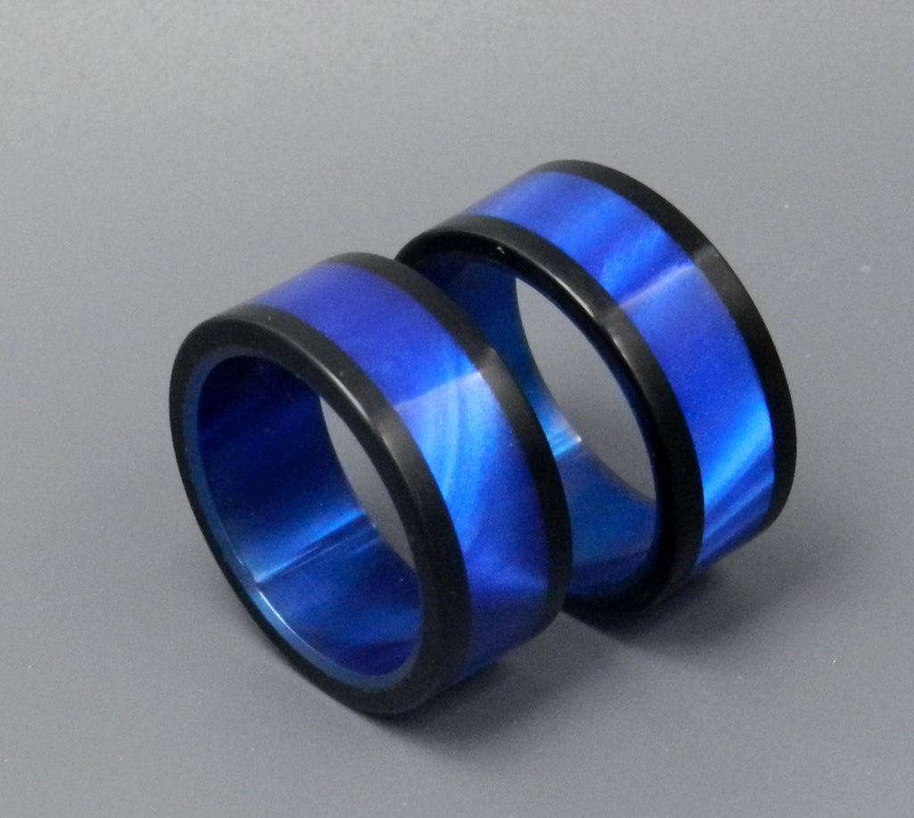 Melt for modern style. These gorgeous rings are made from pure titanium overlayed with two types of resin. We center a generous inlay of brilliant Blue Opalescent between two thin Jet- Black Opalescent edges. A matching anodized interior only magnifies the blue depths of this beautiful ring set. Pictured at 7.9mm.
