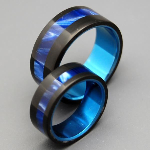 Melt for modern style. These gorgeous rings are made from pure titanium overlayed with two types of resin. Solid black-sheen resin is offset by a brilliant Blue Opalescent overlay. A matching anodized interior only magnifies the blue depths of this beautiful ring set. Pictured at 7.9mm.